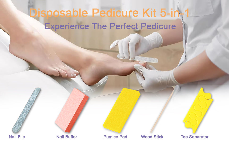 LVKN Disposable Pedicure Kit 5-in-1 (Nail Buffer, Pumice Pad, Nail File 100/180 Grit, Wood Stick and Toe Separators) Complete Pedicure Kit for Salon or Home Use.